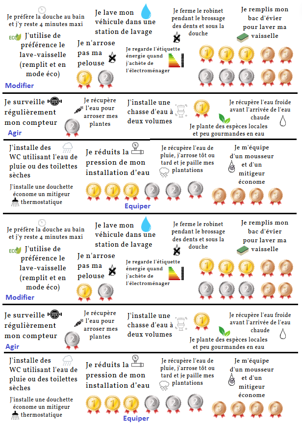 - Repérage et comptage de tous les robinets avec surveillance (tour de rôle) des possibles fuites (toilettes comprises)